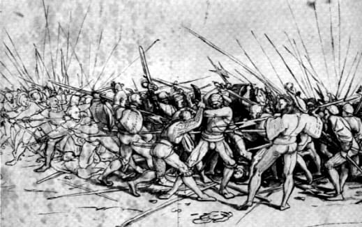 “All’inizio dell'autostrada del Sole un cartello indica “Melegnano”. Un nome noto a milioni di automobilisti perchè proprio lì, nella cittadina alle porte di Milano, c #146;è il casello dell’Autosole. Per francesi e svizzeri Melegnano si chiama “Marignano #148; e non è affatto famosa per gli ingorghi automobilistici. Gli studenti delle medie di Parigi o di Losanna la conoscono per quella che è passata alla storia come “la battaglia dei Giganti”. Il 13-14 settembre 1515 il ventenne Francesco I, discendente dei Visconti e da poco sovrano di Francia, scatenò i 12.000 cavalieri e i 18.000 fanti della sua armata contro le truppe confederate: ventimila milanesi, spagnoli, veneziani e papalini unitisi per contrastare, invano, la conquista francese della Lombardia. I Giganti che 474 anni fa si affrontarono sul campo di Melegnano erano da una parte i migliori cavalieri di Francesco I, dall’altra i mercenari svizzeri, alleati ai confederati, che avanzavano impavidi facendosi scudo con le loro lunghe lance. Fu la prima campagna d’Italia, pianificata a Parigi, prima di una serie che condurrà a Napoleone III e all’indipendenza italiana. Melegnano-Marignano per i francesi è una località importante perchè indica di fatto l’inizio della loro supremazia in Europa occidentale, che si prolungherà fino all’Ottocento. Per gli svizzeri è ancor più importante perchè segna l’inizio della loro celebre neutralità. Fu l’ultima volta che soldati regolari svizzeri, inviati dai vari Cantoni, scesero in campo dietro la bandiera rossocrociata. Dopo la sconfitta di Melegnano i mercenari continuarono a combattere ma solo sotto altri vessilli: quello dei Re di Francia, quello del Papa. Il sogno di un’espansione elvetica era tramontato per sempre”. (di Paolo Poletti, “Paese Sera”, 30.10.1989)