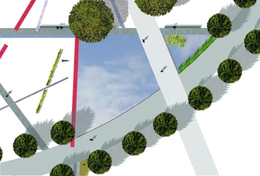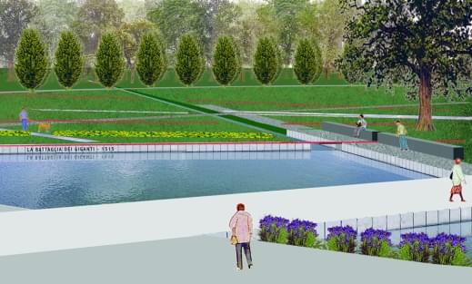 La vasca diventa anche percettivamente elemento chiave a cavallo tra le due parti del parco separate dal viale centrale localizzandosi nel punto nodale tra il viale stesso e il percorso semicircolare che racchiude il grande prato e si attesta sulla scena nel prato al centro dell’arena.