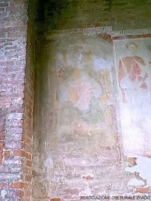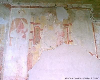 (...) Se l'interno della chiesetta di S.Maria è stato più tardi ridipinto, sul prospetto esterno del piccolo edificio tutta una fitta serie di avanzi affrescati lascia immaginare la preesistenza di un'animata decorazione pittorica per la cui data di esecuzione si è pensato alla seconda metà del Quattrocento: la cromia, che oggi appare quasi del tutto sbiadita, è certamente ben diversa da quella degli inizi, quando la vivacità e il contrasto dei colori doveva modulare un vivido rivestimento pittorico, adatto anche per una visione a distanza, per chi veniva da lontano. Ai lati della finestrella di sinistra, sono appena visibili alcuni dettagli affrescati, verosimilmente relativi a rappresentazione di santi. Suggestiva ne è la visiono offerta in una vecchia immagine fotografica - compresa in quell'interessante nonchè raro repertorio, pubblicato nel 1934, e già dedicato ai Comuni della provincia di Milano - dove la fronte della chiesetta appariva maggiormente rivestita di intonaco, rispetto allo stato attuale. A un esame ravvicinato, oggi si intravede, in particolare, sulla sinistra, una testa aureolata, con veste rossa e manto giallo, forse piegato su una spalla, nonchè una mano che regge, a quanto pare, la palma, simbolo del martirio: se ne intravede anche parte di una cornicetta affrescata di rosso e delimitata internamente di bianco, che, certo, racchiudeva l'immagine, già riconosciuta come una rappresentazione di santa (o, forse, piuttosto, per il tipo di mantello ipotizzato, un santo pellegrino, ossia S.Rocco, che era uno dei santi all'epoca più rappresentati, poichè si riteneva proteggesse dal terribili flagello della peste, insieme a S.Sebastiano, forse già affrescato, in simmetria, sul prospiciente lato).