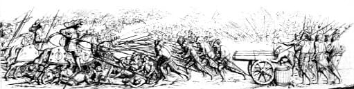 La "Battaglia dei Giganti" (o di Marignano) sul rilievo marmoreo (1548) di Pierre Bontemps, per la tomba di Francesco I�, a Saint Denis. |